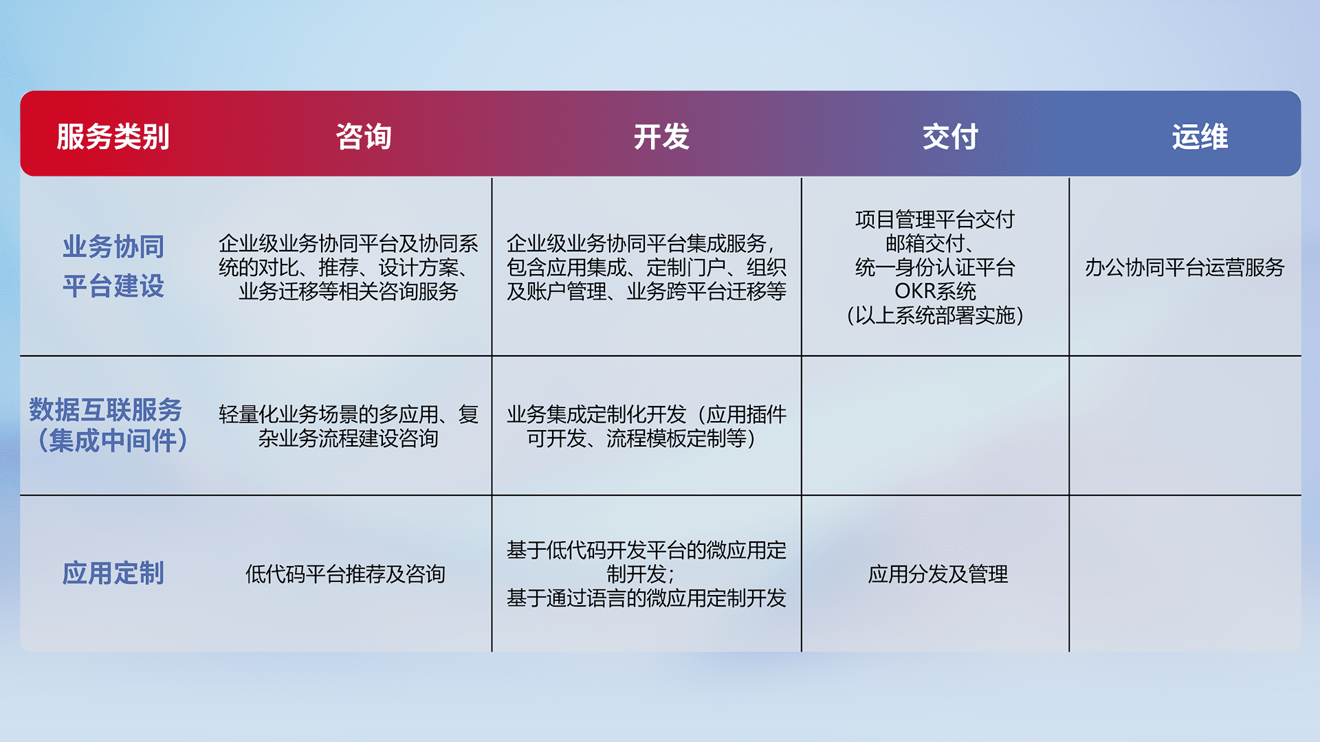 针对钉钉、、企微、、、、IDaas等平台级产品提供产品的规划、、方案、、、、交付、、定制化开发等服务,,实现如统一协同办公、、、智能客户服务、、、混合会议管理、、智能数据查询、、、、等业务场景,,,,实现数字化转型。。。