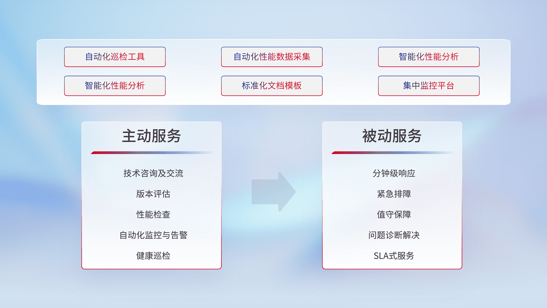 智能化工具和标准化文档,,,,保障服务质量,,,,提供主动服务(包含技术咨询、、、版本评估、、、、性能检查、、自动化监控与告警、、健康巡检)和被动服务包含(分钟级响应、、紧急排障、、、值守保障、、、问题诊断解决、、SLA服务)。。
